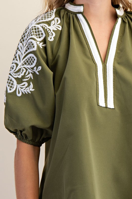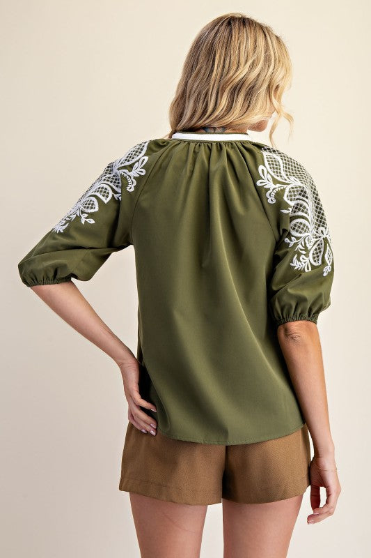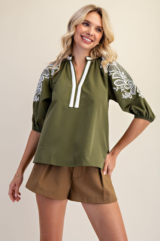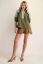 This olive V-Neck Trim Placket Midi Sleeve Top offers a perfect blend of style and comfort. The contrasting cream-colored details highlight the neckline and placket, adding subtle sophistication to your look. Its midi-length sleeves make it ideal for transitional weather, providing coverage without sacrificing ease of movement. A versatile addition to your wardrobe that effortlessly pairs with both casual and dressier outfits.