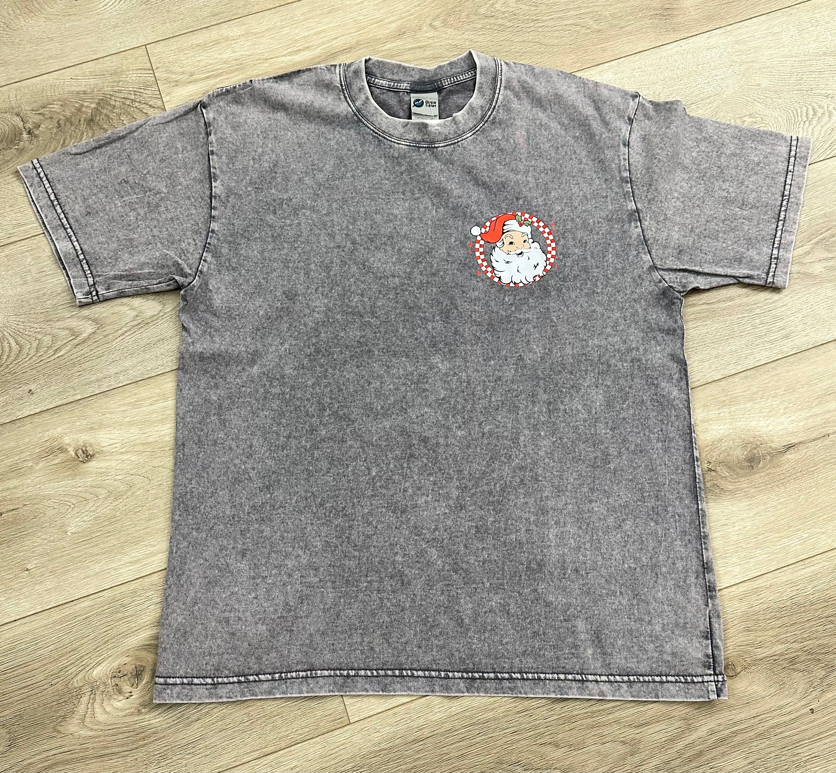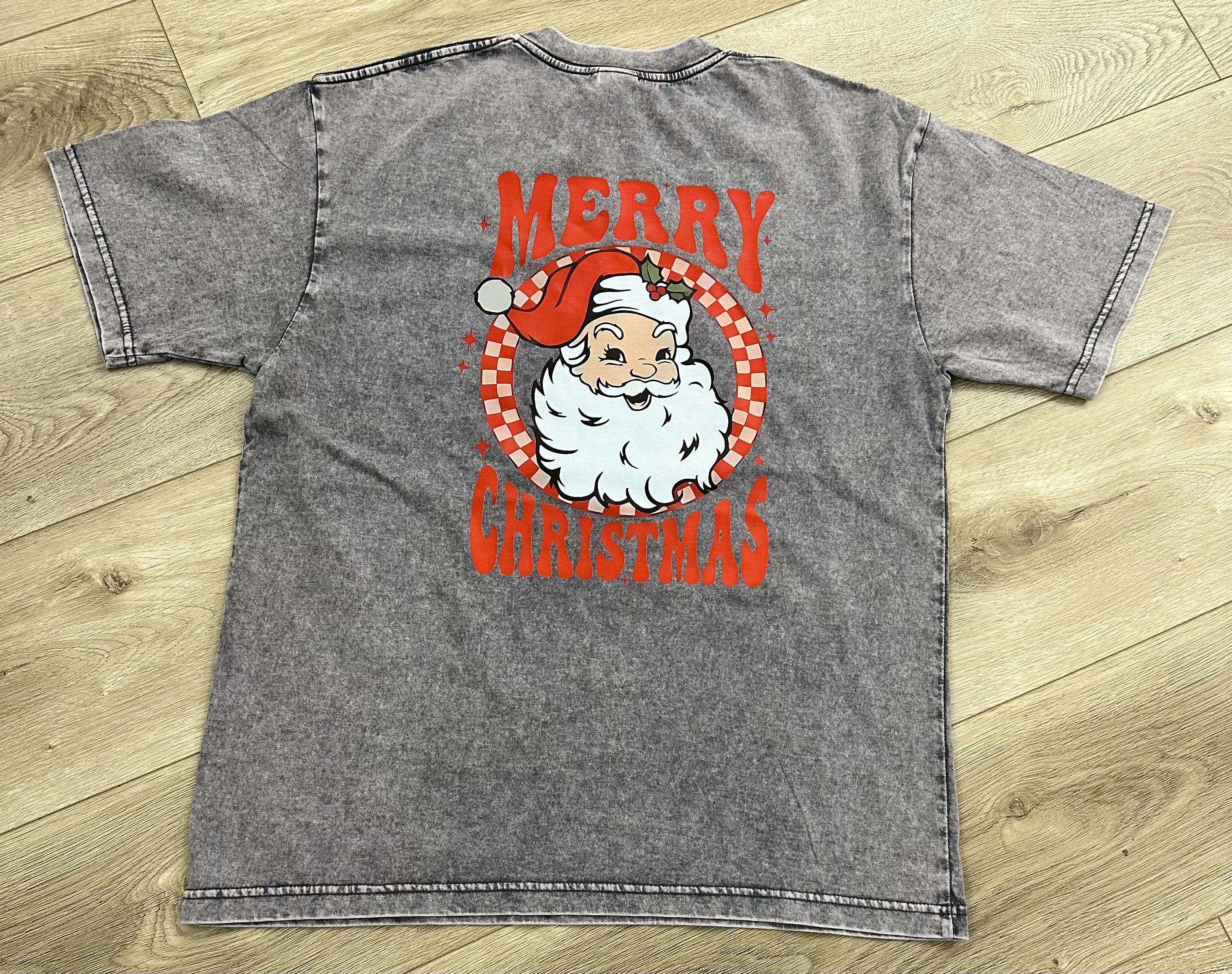 Get in the holiday spirit with our Vintage Washed Christmas T-Shirt! This grey shirt features a vintage Santa face on the front and a larger image on the back with the words "Merry Christmas" surrounding it. The vintage washed fabric adds a unique touch. Spread holiday cheer in style!