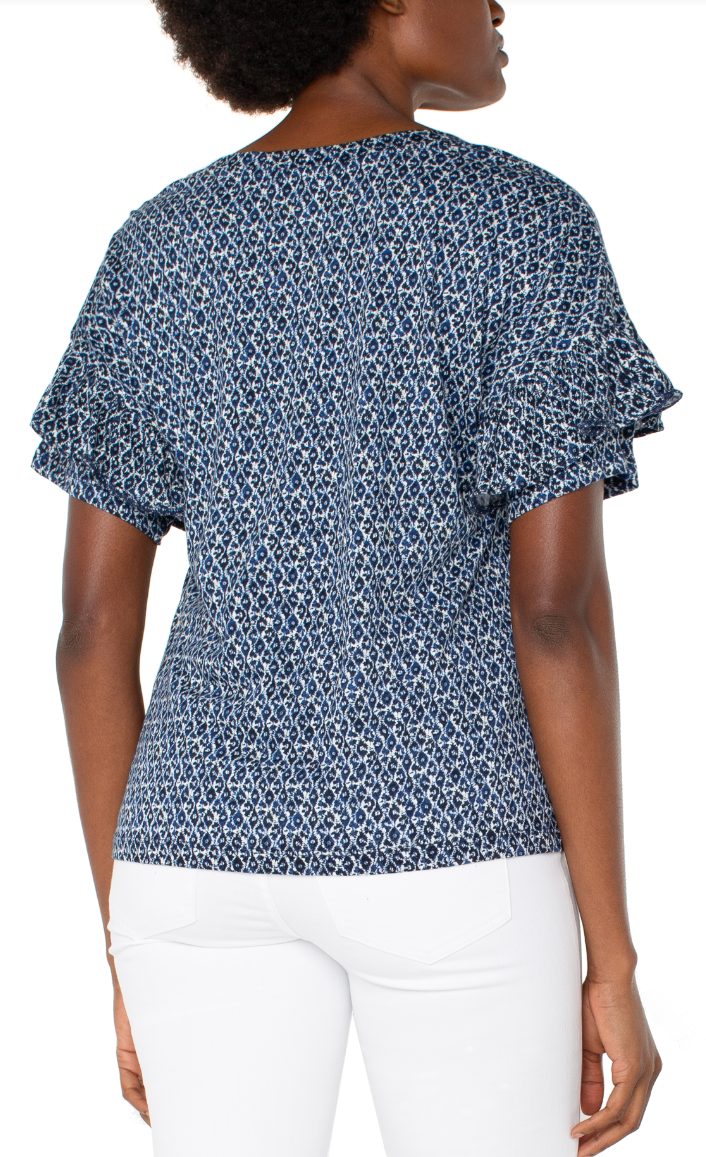 Indulge in effortless style with our 1/2 Sleeve Drop Shoulder Knit Top. The ruffle detail and navy cream batik design elevate this top, making it perfect for any occasion. Stay comfortable and fashionable with this must-have addition to your wardrobe.