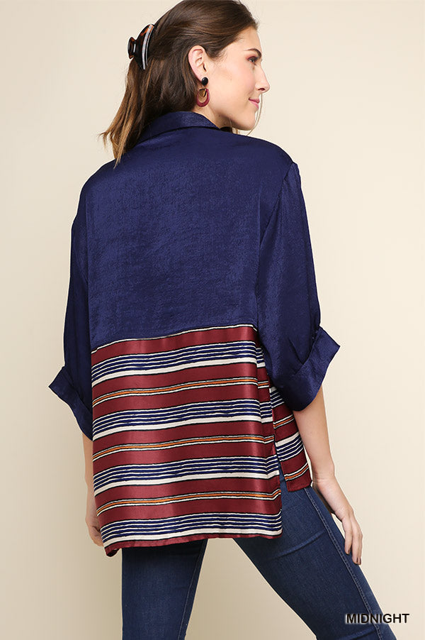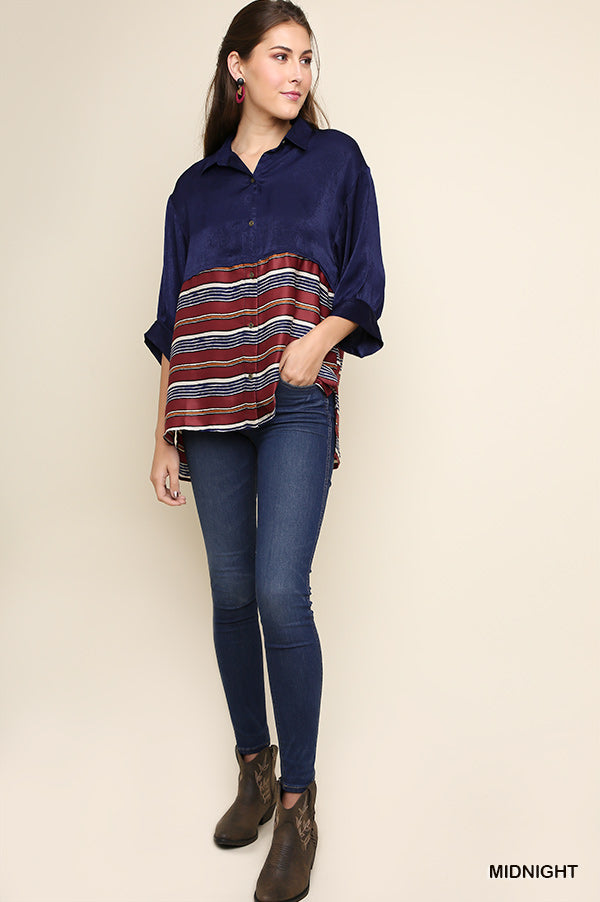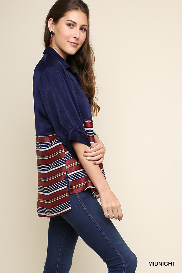 3/4 Sleeve Satin Solid and Striped Button Down Collared Top with High Low Hem and Side Slits