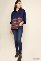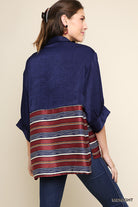 Elevate your wardrobe with this sophisticated 3/4 sleeve satin button-down top. The midnight base provides a versatile canvas, while maroon stripes along the hem add visual interest and depth. Delicate gold and white accents create an upscale, layered look that transitions seamlessly from office to evening. The luxurious satin fabric drapes beautifully and catches the light, making this piece a standout choice for anyone seeking polished style with personality. Perfect for pairing with tailored trousers, skirts, or dressed-down with your favorite denim.