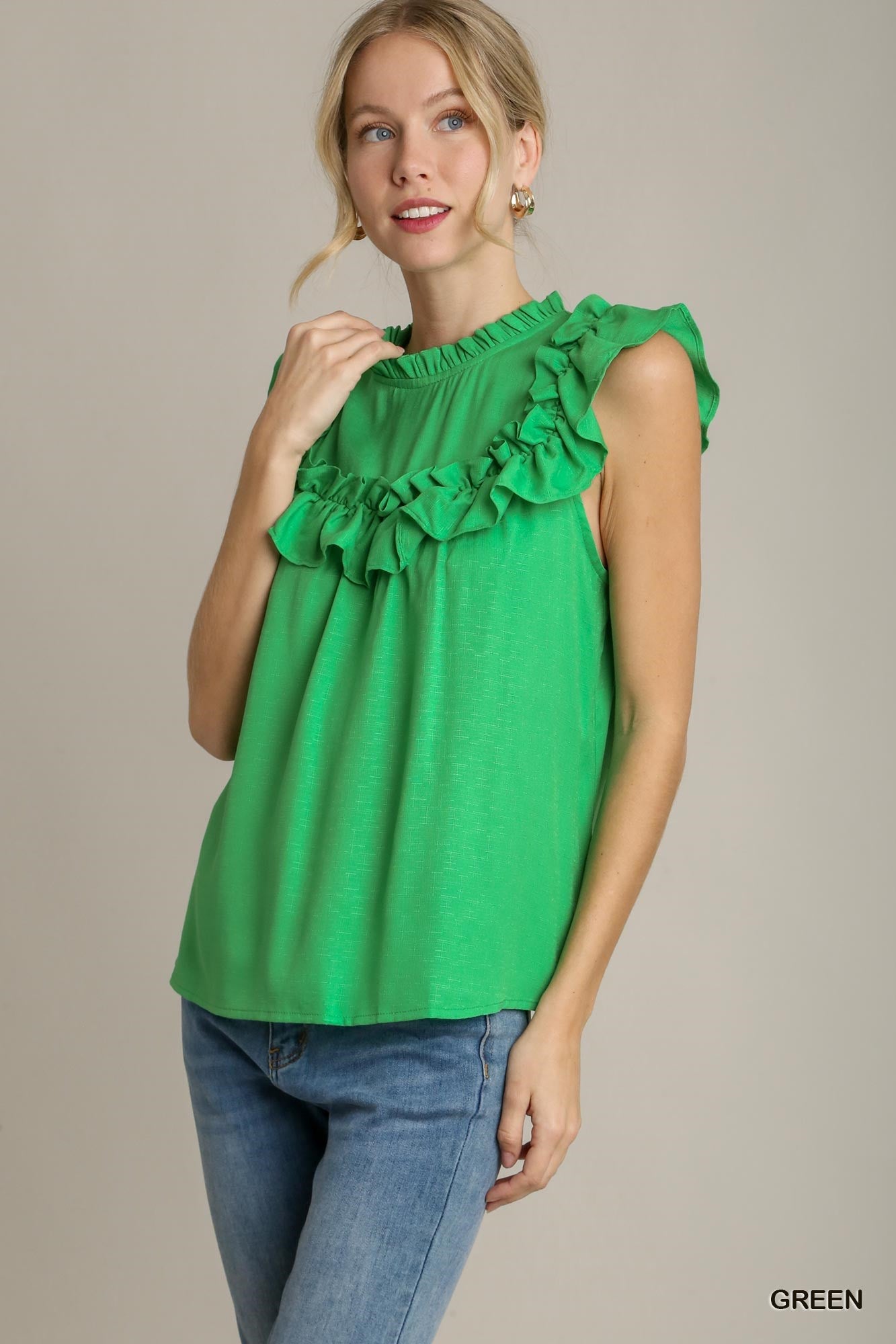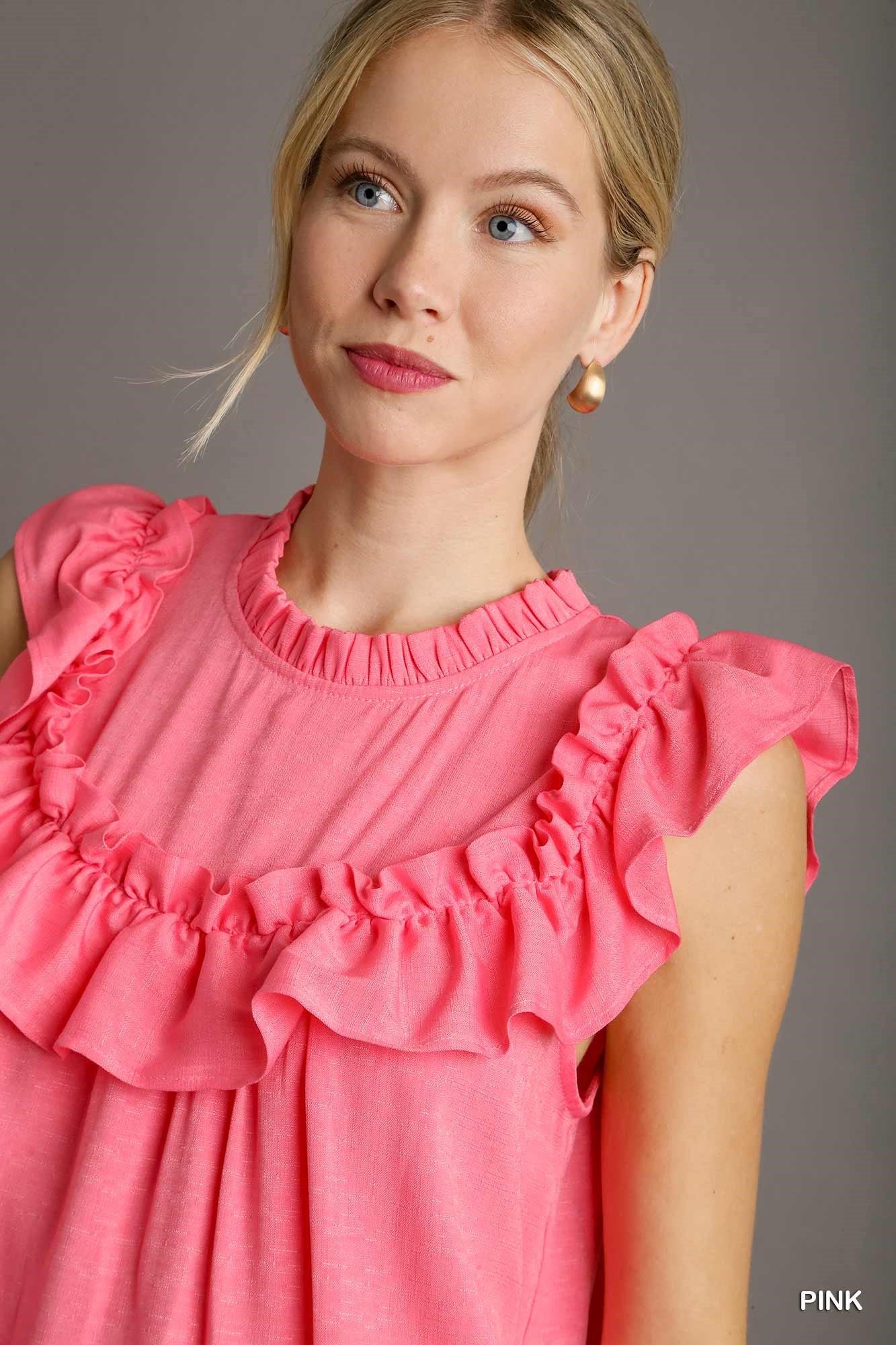 Delicate ruffle detailing adds movement and feminine charm, while the back button keyhole closure provides a subtle, refined finish. Easy to style and comfortable to wear, this piece transitions seamlessly from casual days to dressed-up moments—making it a versatile staple you’ll reach for again and again.
