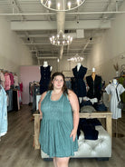 Look breathtaking in our CRINKLE DETAIL TOP DRESS W/BACK LACE TIE. This stunning dress features a teal color and intricate crinkle detailing, topped off with a delicate lace tie in the back. Stand out and feel confident in this elegant and unique piece.