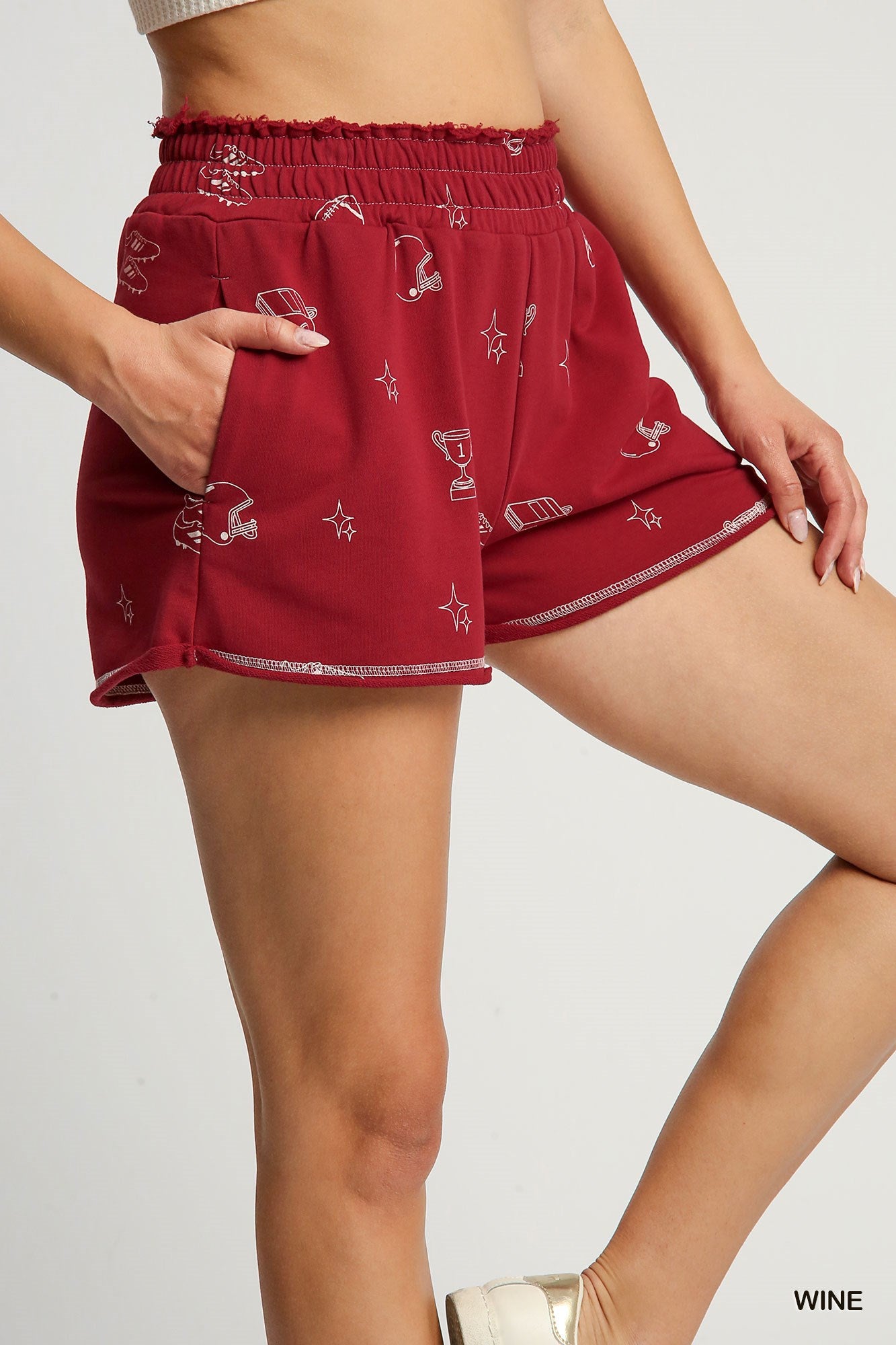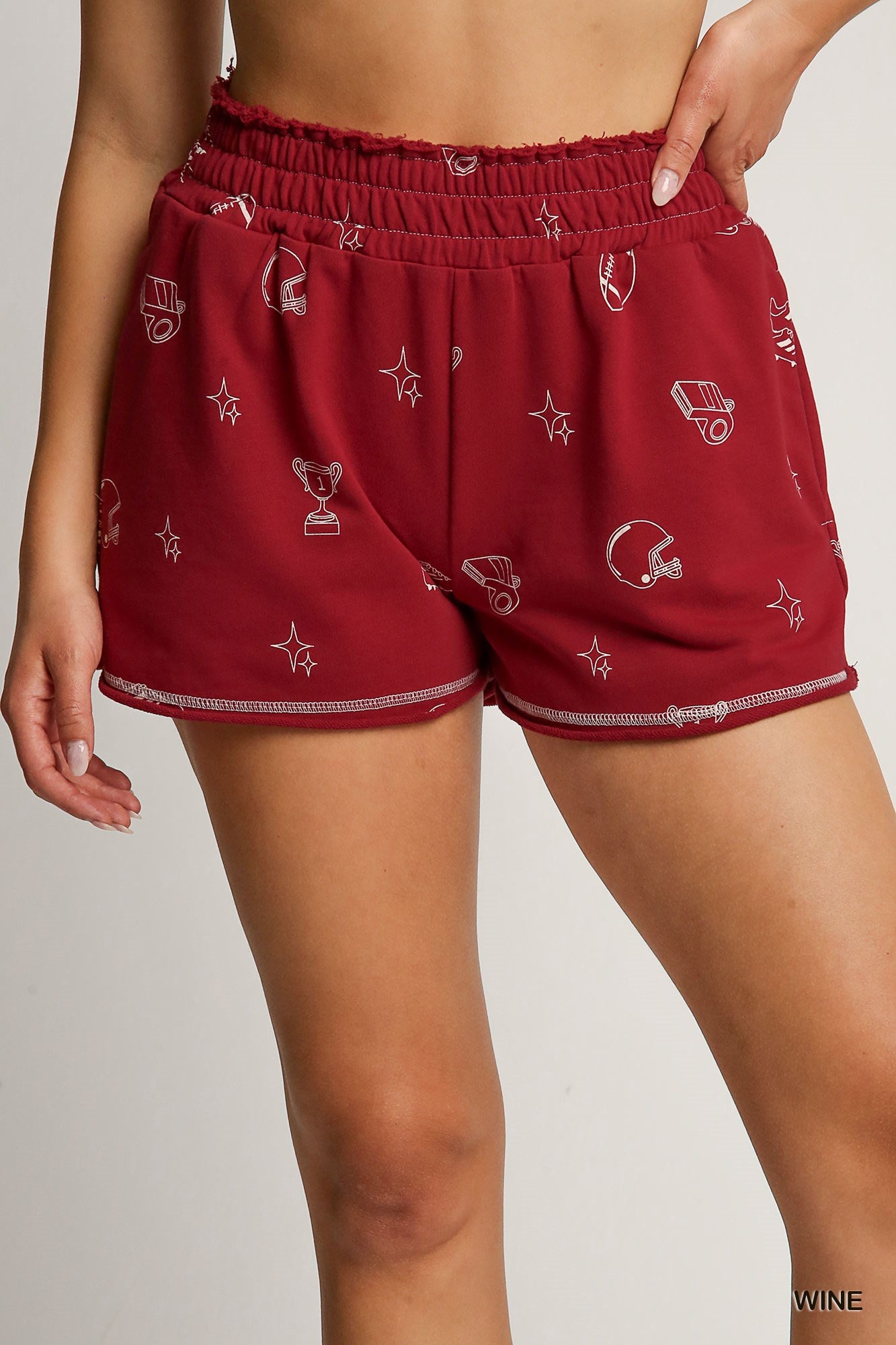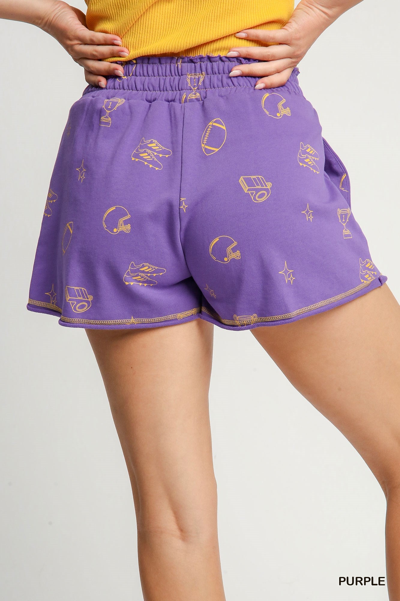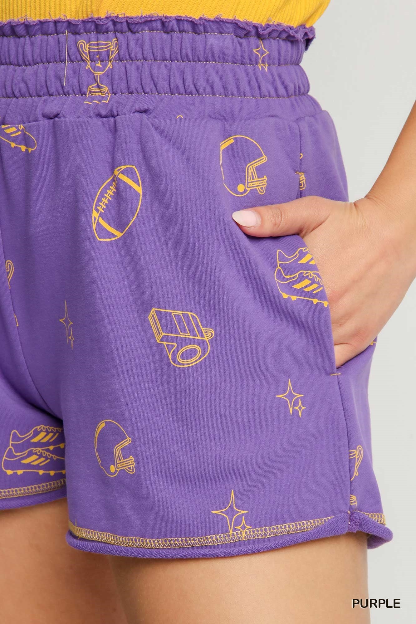 Featuring a comfortable elastic waistband and relaxed fit, these shorts are as functional as they are fun. The playful all-over print showcases classic school spirit iconsâincluding footballs, helmets, and trophiesâmaking them a standout choice for sports fans and school pride outfits alike.