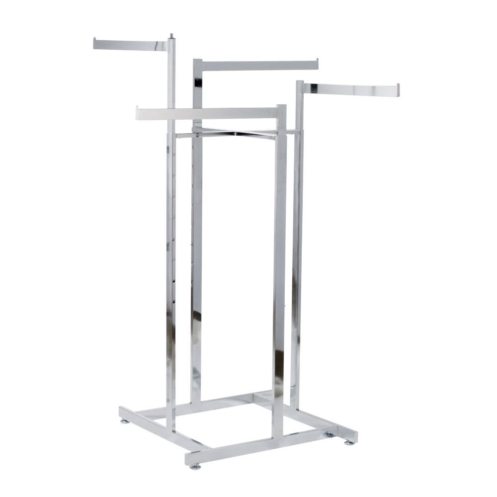 High Capacity 4-Way Clothing Rack holds 20% more than standard retail racks. This retail clothing rack has four straight 24 in. uprights that can be independently adjusted every 3 in. from 48 in. to 72 in. Rectangular tube base and arms. Includes adjustable levelers.