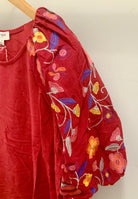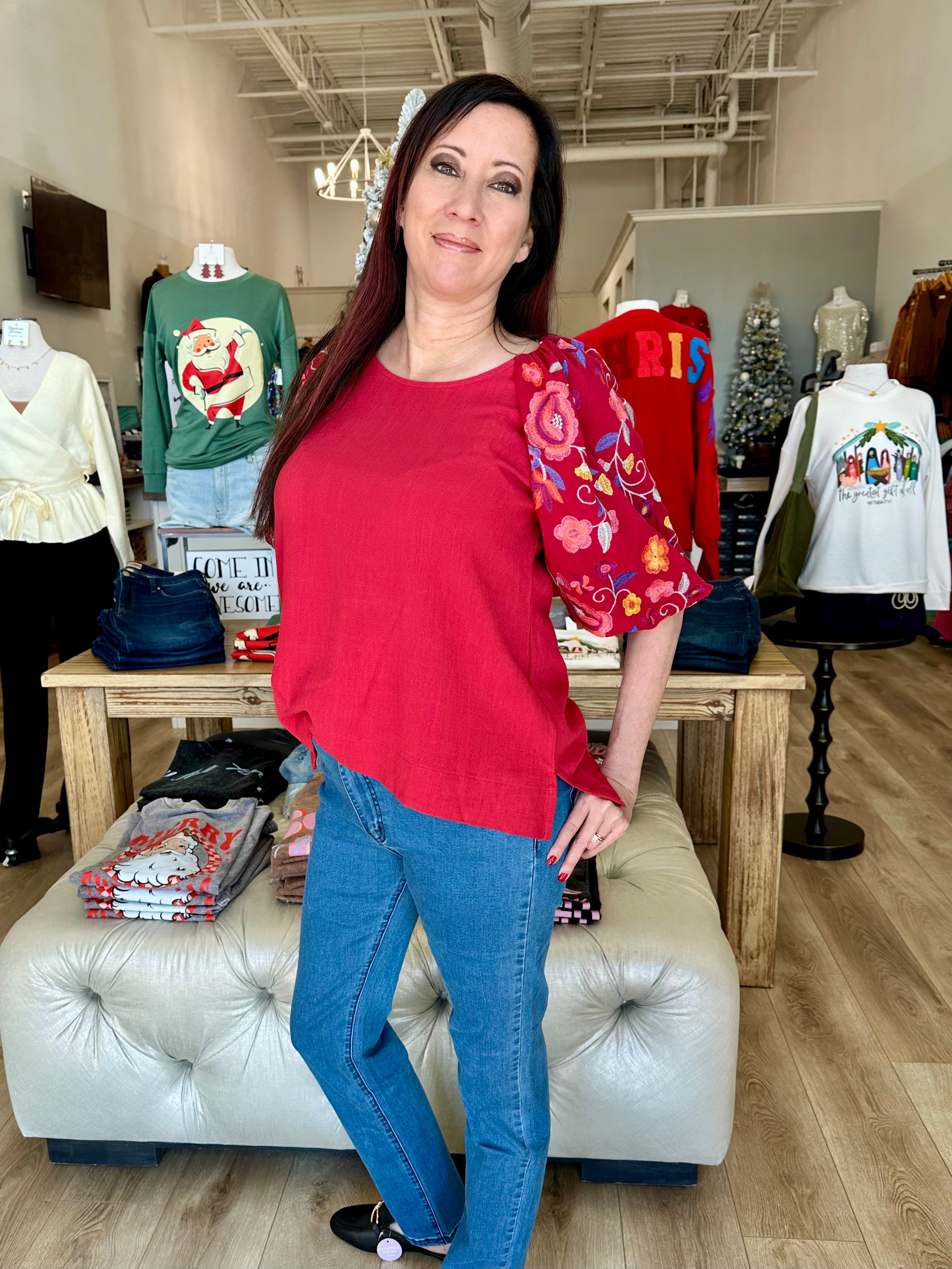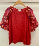 Linen Blend Top with Embroidery Balloon Sleeve & Slide Slit