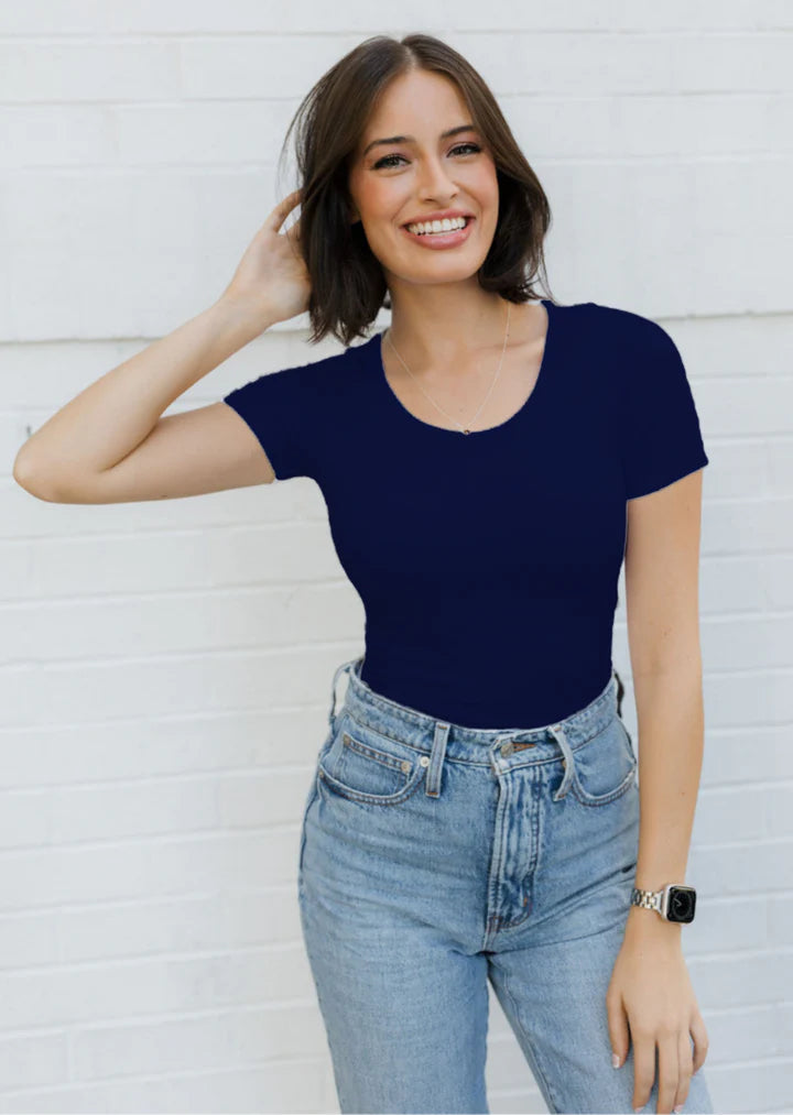 Our Classic Short Sleeve Top, designed for a flawless silhouette. With a longer length for support and control, it smooths seamlessly with a reversible neckline - choose between a scoop or boat neck. This versatile top is perfect for everyday wear, making you feel confident and elegant.