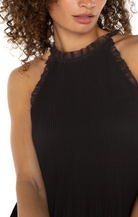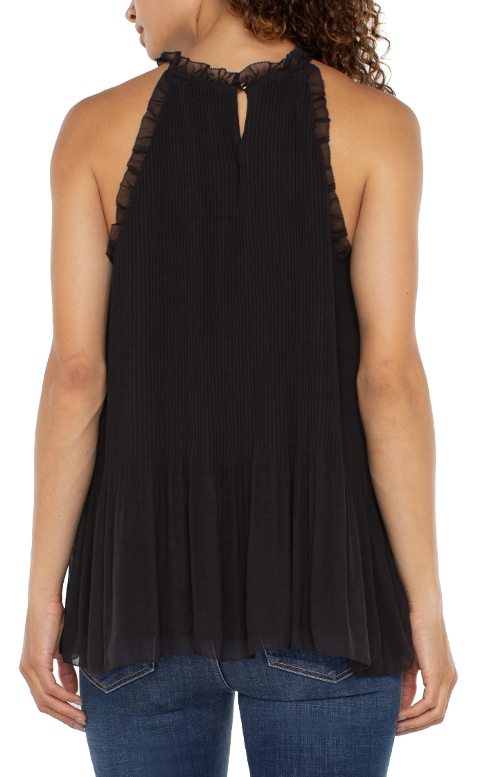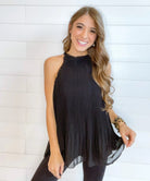 Make a statement in this sleeveless halter featuring a chic ruffle detail. Showcasing feminine details, this top is perfect for brunch or special occasions. Pairs with denim or trousers effortlessly!