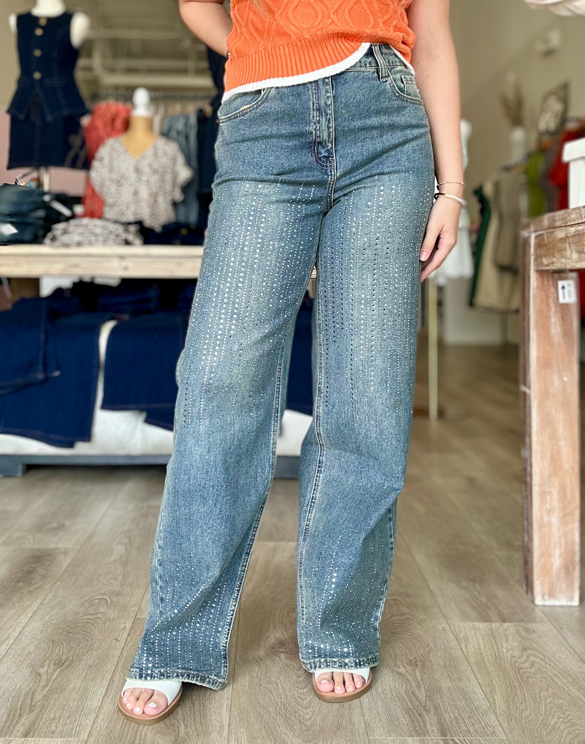 SQUARE RHINESTONE LINES EMBELLISHED HIGH RISE ULTRA WIDE LEG JEANS