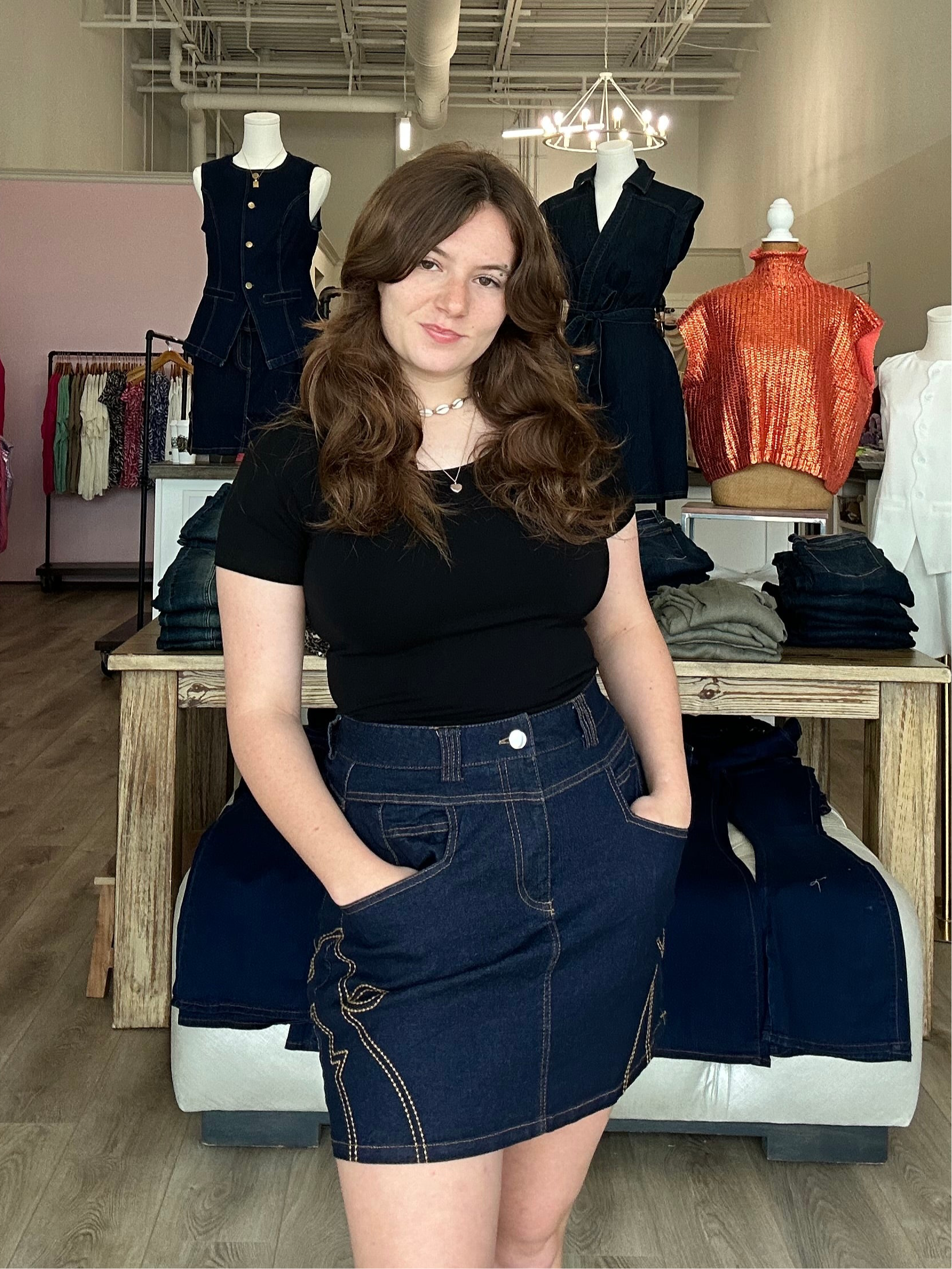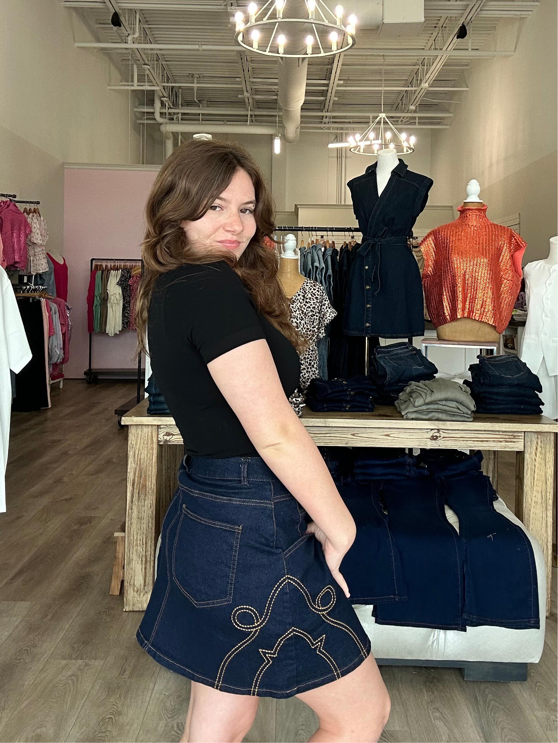 "Unleash your inner cowgirl with our STRETCHED DENIM COW GIRL SKIRT. The dark denim is both stylish and durable, perfect for any adventure. No need to sacrifice comfort for fashion - our denim skirt provides both!"