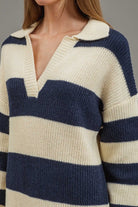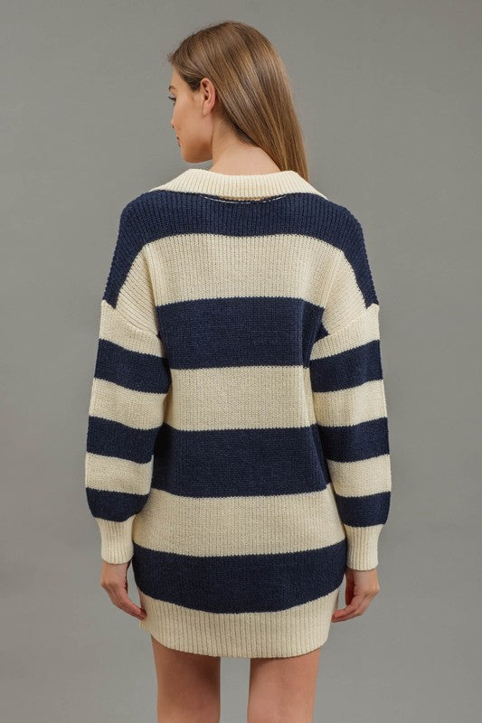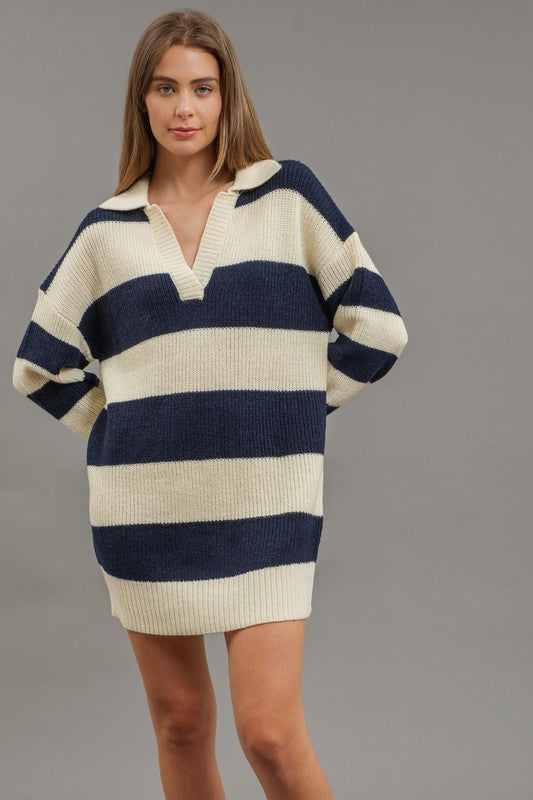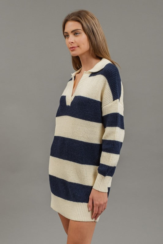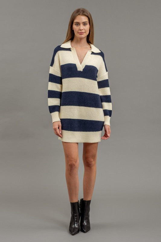 STRIPE COLLARED LS MINI SWEATER DRESS