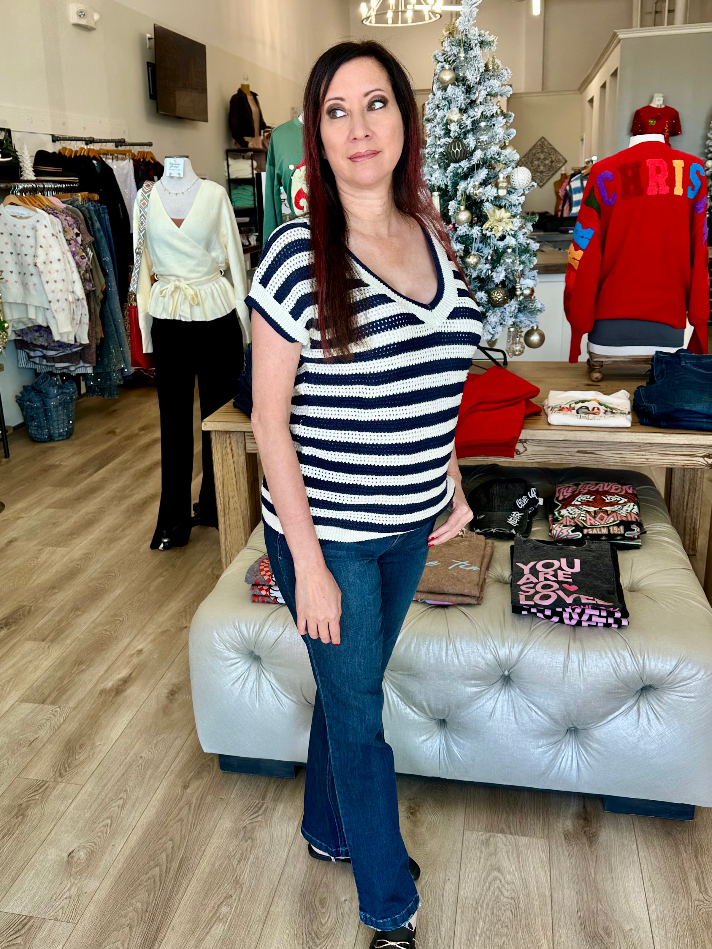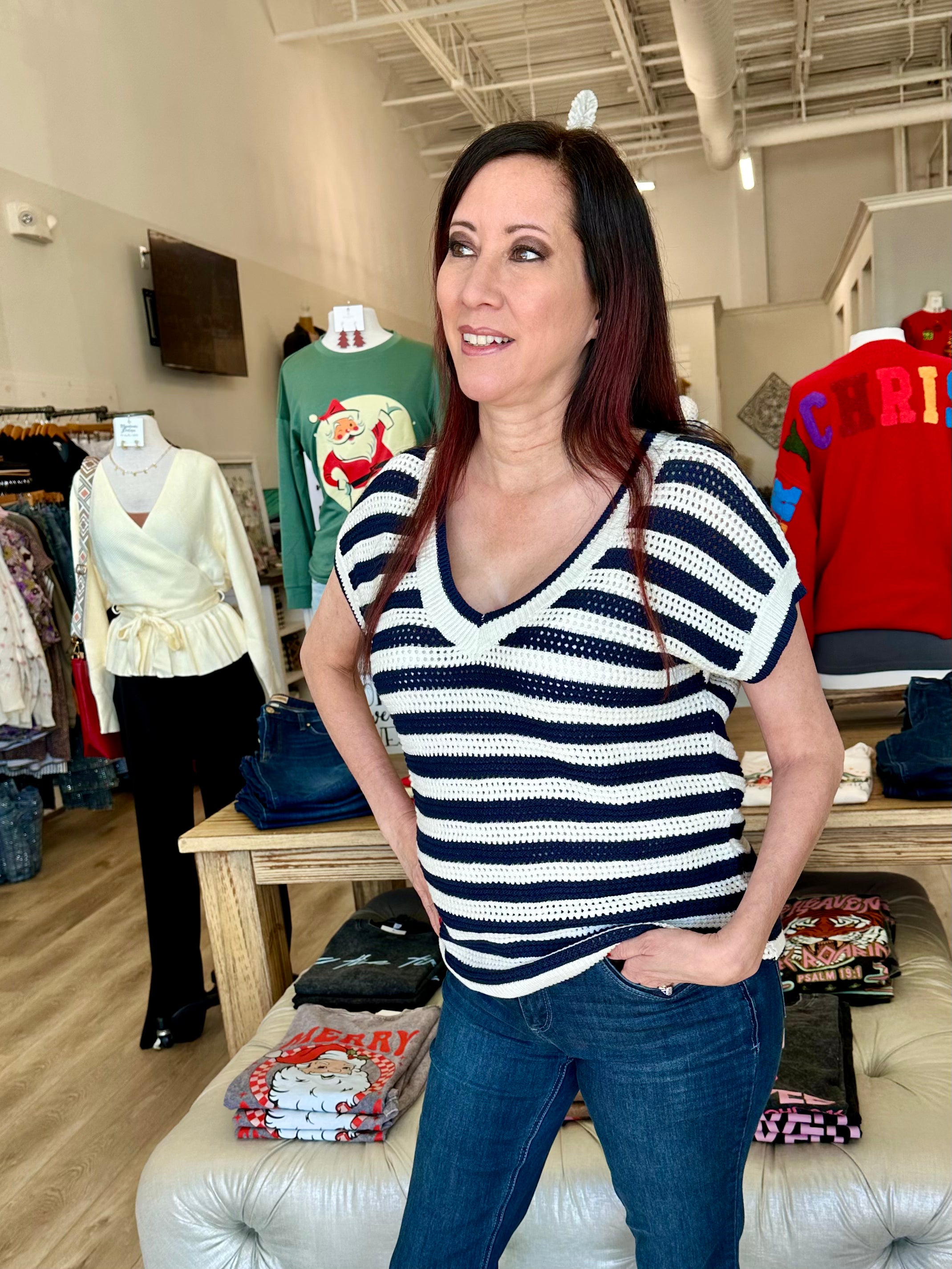 Elevate your wardrobe with our Stripe V Neck Crochet Knit Short Sleeve Sweater! The perfect combination of style and comfort, this sweater features a unique crochet knit design and a flattering V neckline. Look effortlessly chic and feel cozy in this must-have piece.
