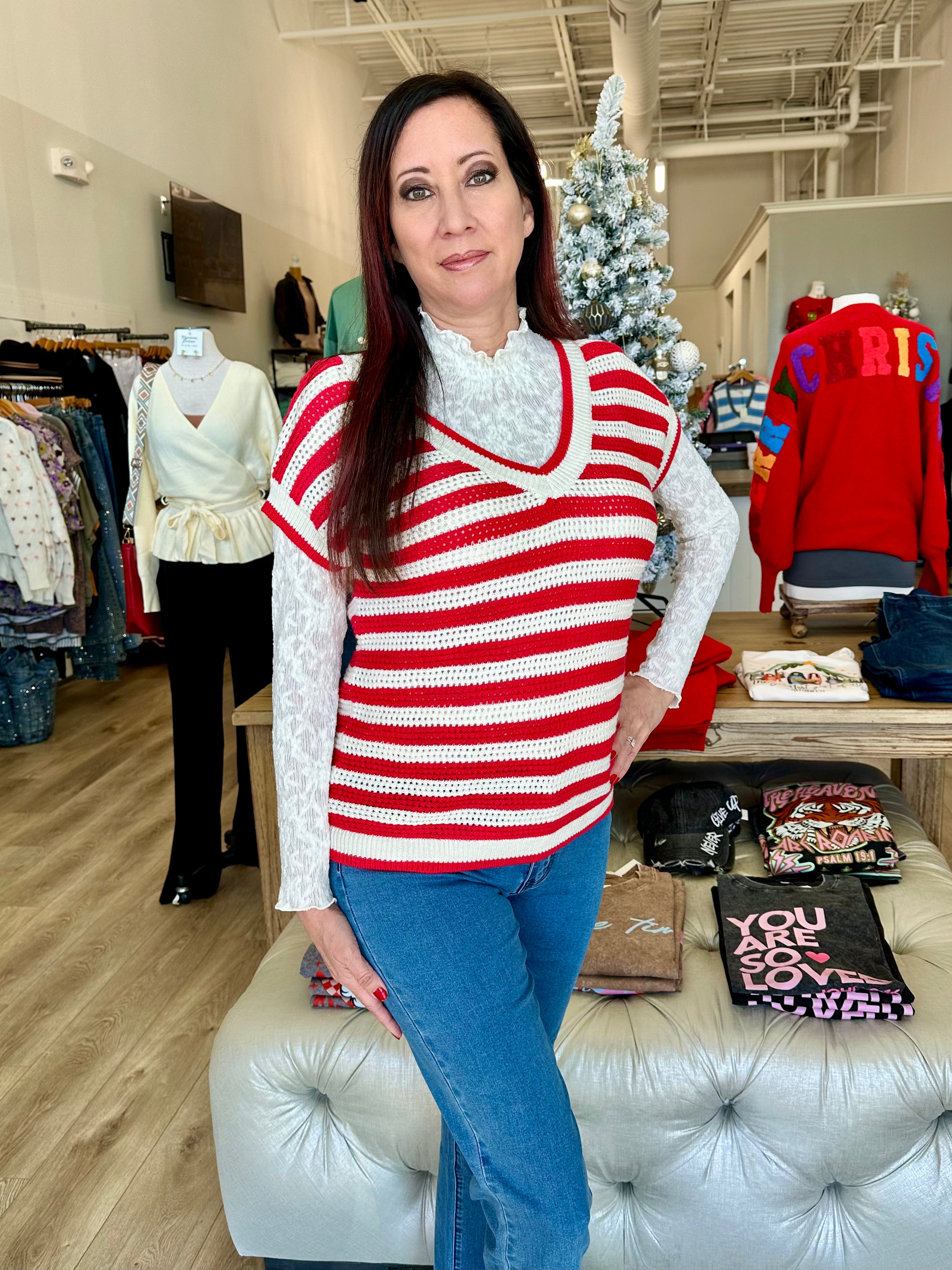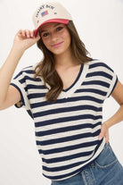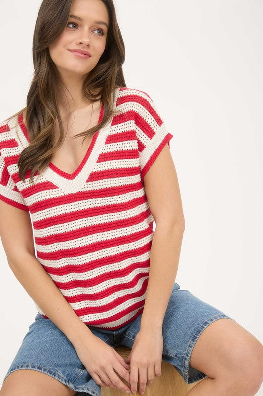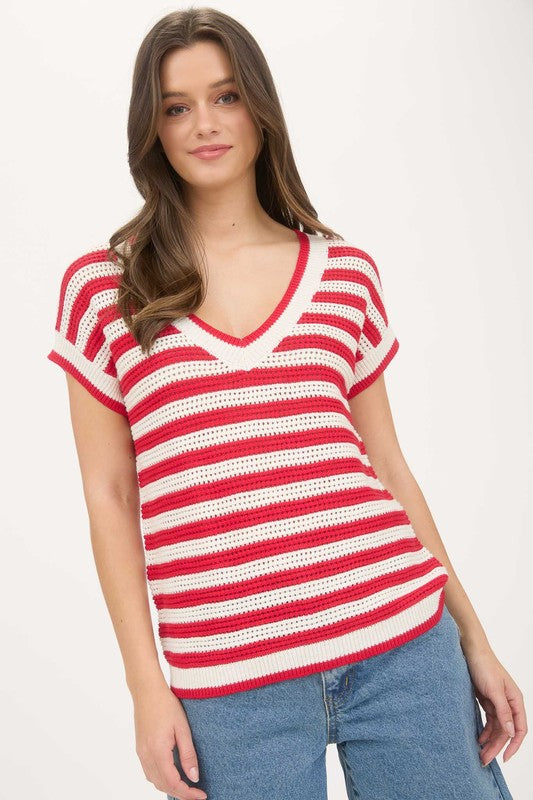 STRIPE V NECK CROCHET KNIT SS SWEATER
