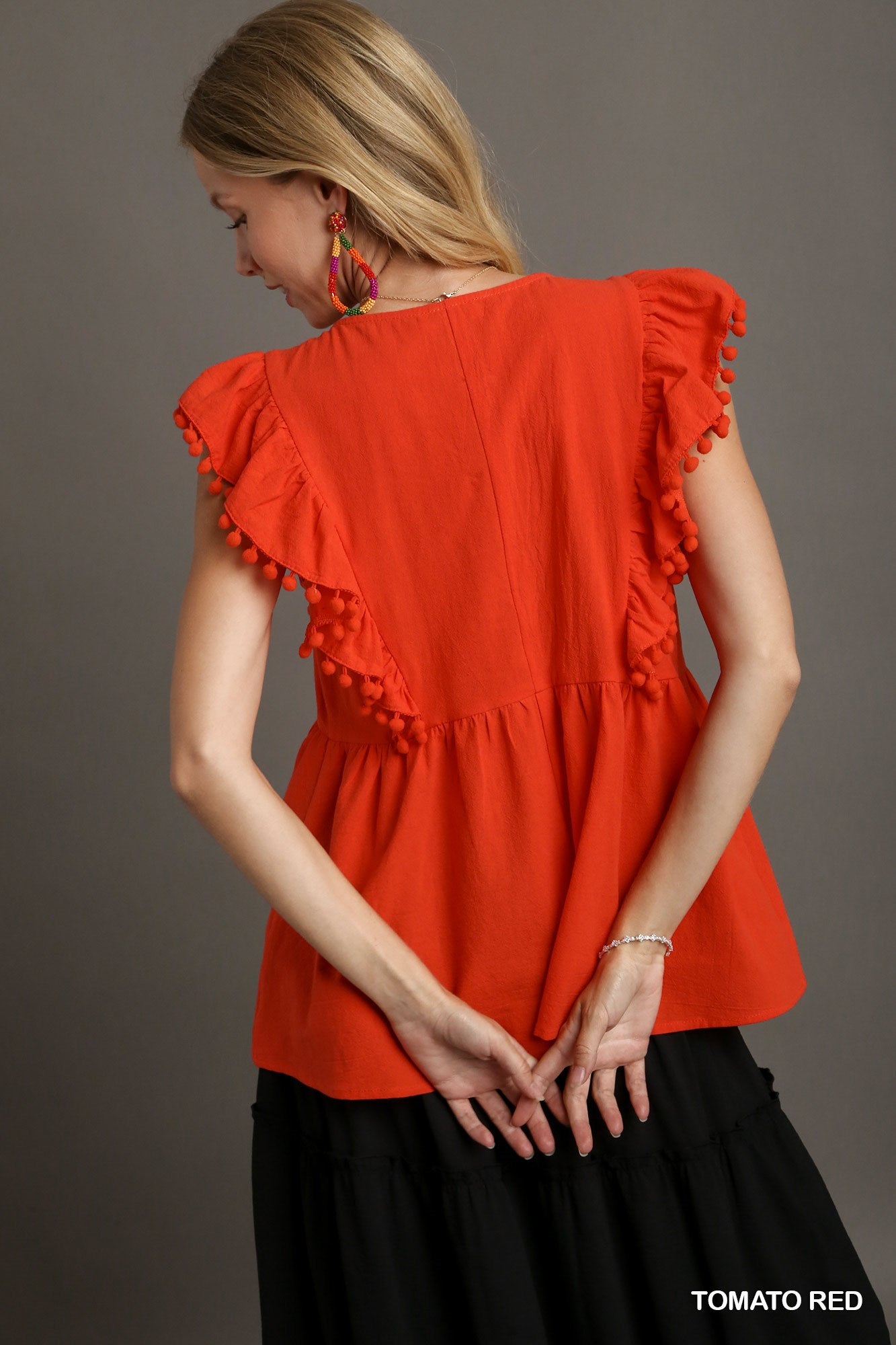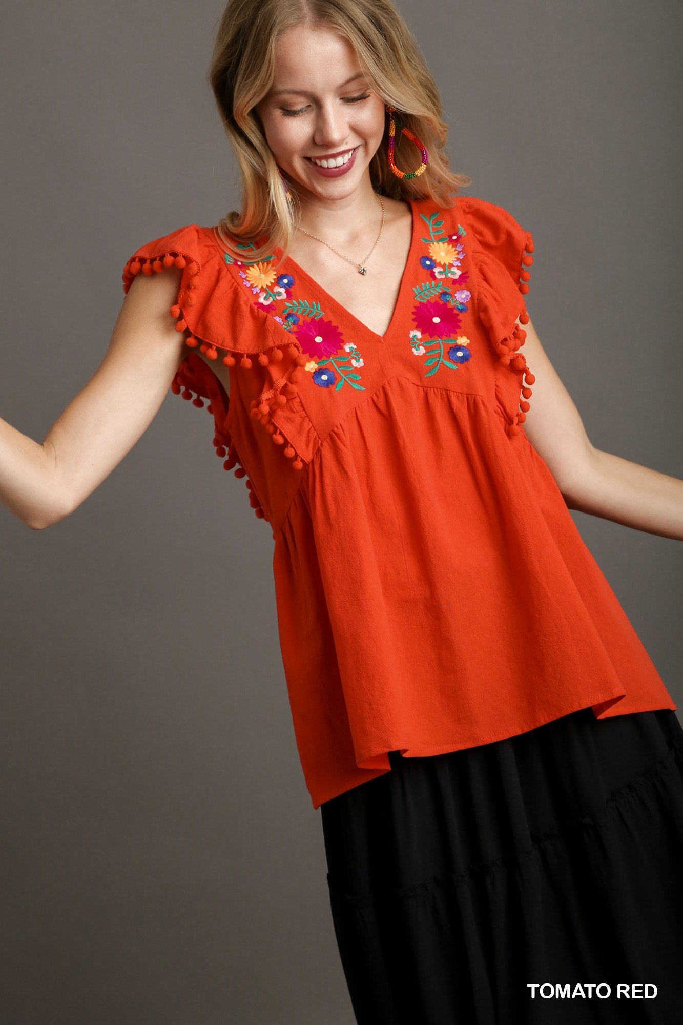 Floral Embroidery Top with Pom Pom Detail – Tomato